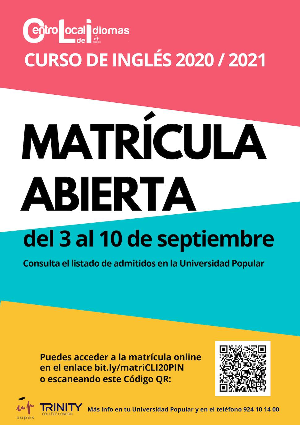 Los admitidos, cuyo listado se puede consultar en la Universidad Popular de Miajadas, deberán formalizar esta matrícula antes del 10 de septiembreYa está abierto el plazo de matrícula en el Centro local de idiomas de Miajadas para el próximo curso 2020-21.
