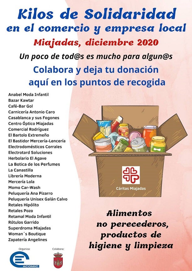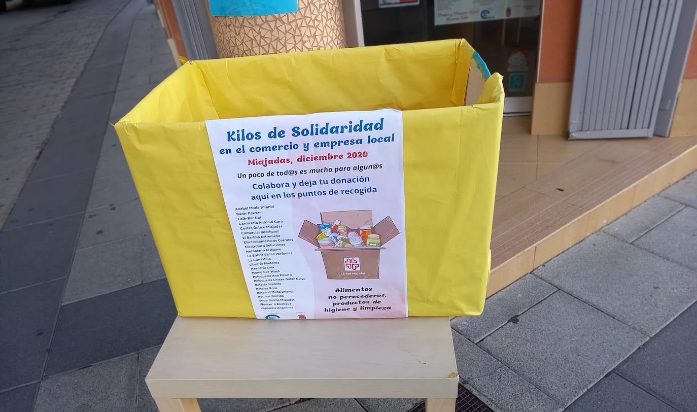 Comercios y empresas miajadeñas han habilitado una caja donde poder dejar donaciones de alimentos no perecederos, productos de higiene y limpieza que serán entregados a Cáritas MiajadasLa Asociación de Comerciantes y Empresarios de Miajadas y Comarca ha lanzado una campaña para promover que en diciembre hay que coger muchos 'Kilos de ... solidaridad en el comercio y empresa local'.