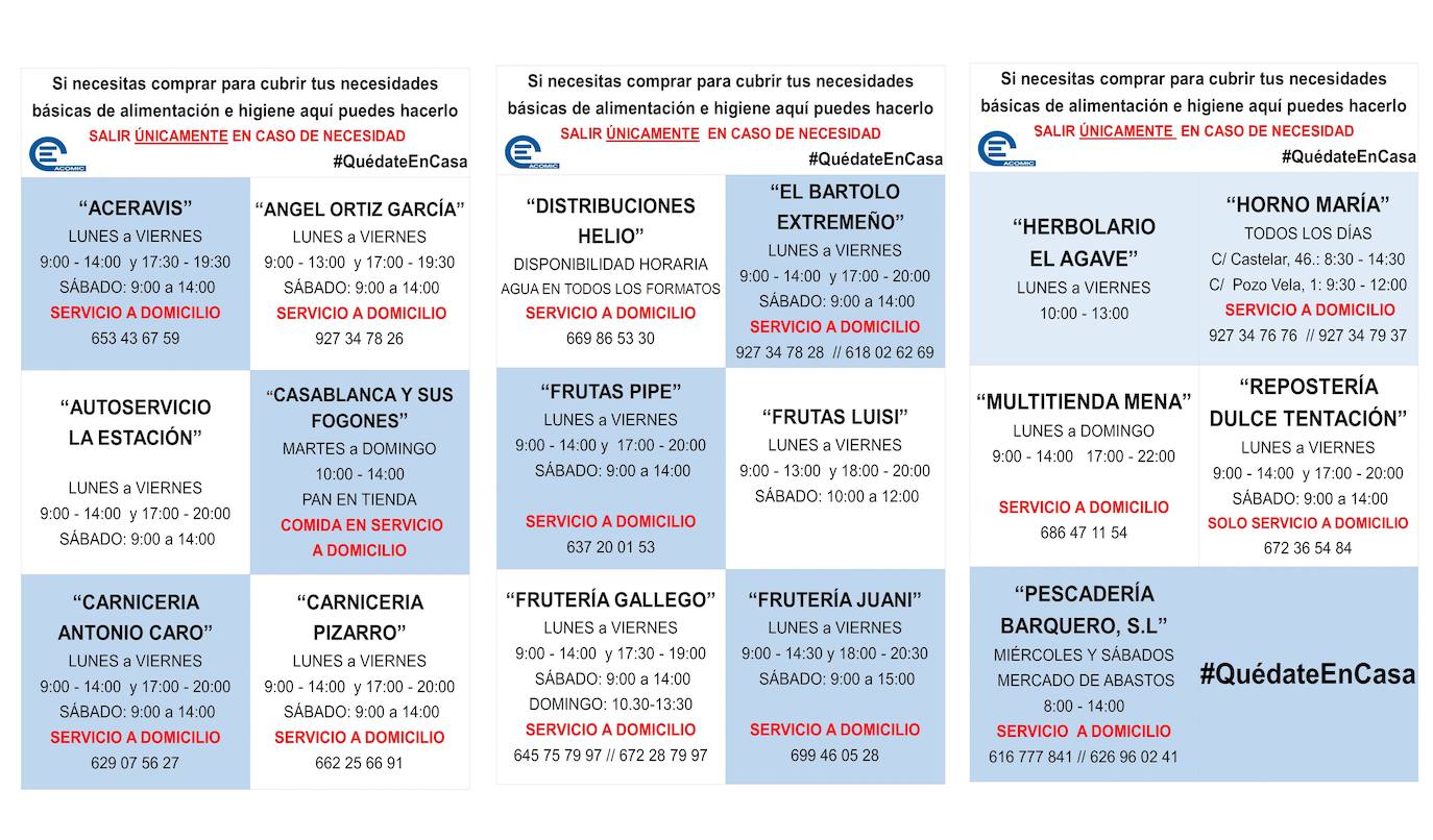 Los establecimientos son el Herbolario El Agave, Horno María, Multitienda Mena, Repostería Dulce Tentación, Pescadería Barquero, Aceravis, Ángel Ortiz García, Autoservicio La Estación, Casablanca y sus Fogones, Carnicería Antonio Caro, Carnicería Pizarro, Distribuciones Helio, El Bartolo Extremeño, Frutas Pipe, Frutas Luisi, Frutería Gallego y Frutería Juani. Los horarios y direcciones de estos establecimientos pueden encontrarse al final del artículo.