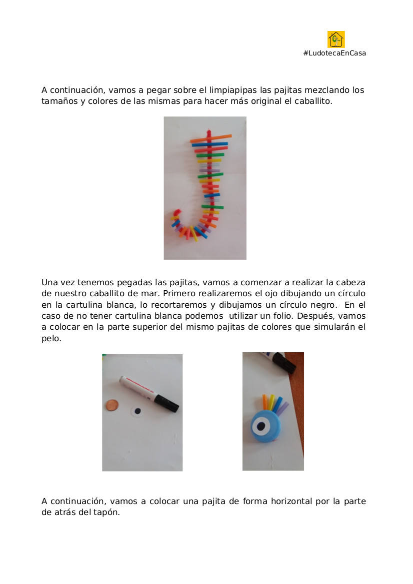 A pesar de poder salir a pasear a la calle, los pequeños necesitan seguir divirtiéndose en casa el resto del díaLos alumnos de #Ludotecaencasa realizan esta semana un circuito de bolas vertical y un caballito de mar articulado.