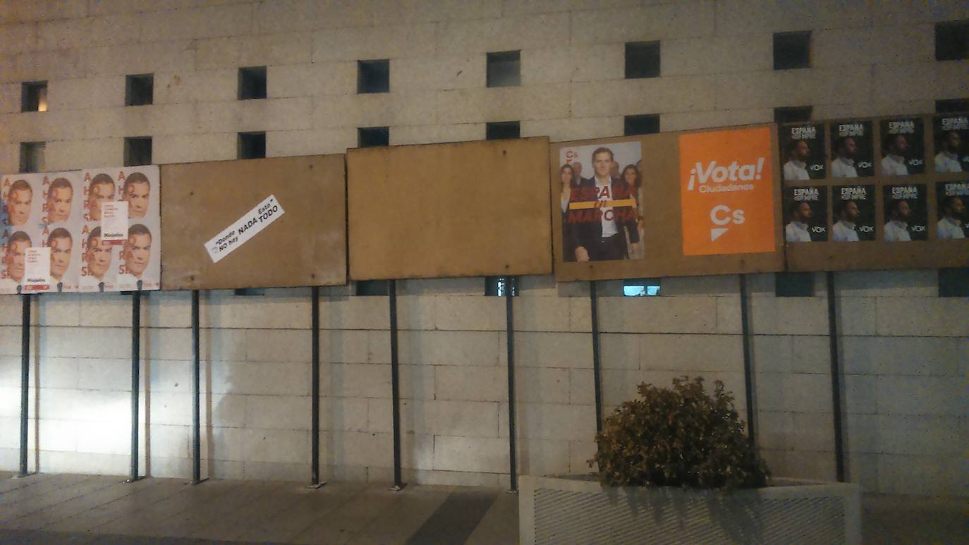 Otra novedad es que, esta vez, han centrado la puesta de carteles en los paneles habilitados para este fin en la pared lateral del Ayuntamiento de la localidad.