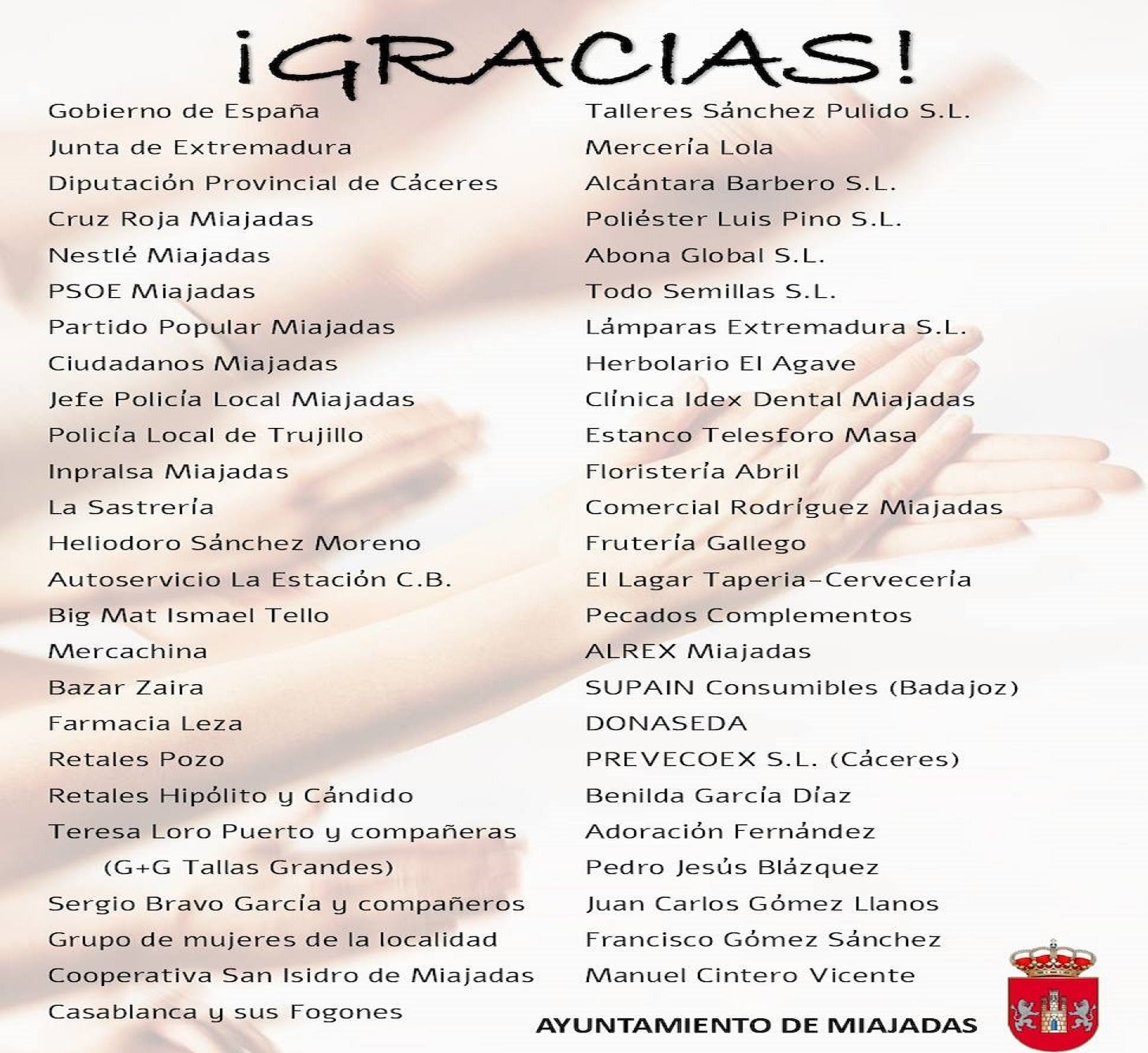 El Ayuntamiento de Miajadas hace extensivos sus agradecimientos