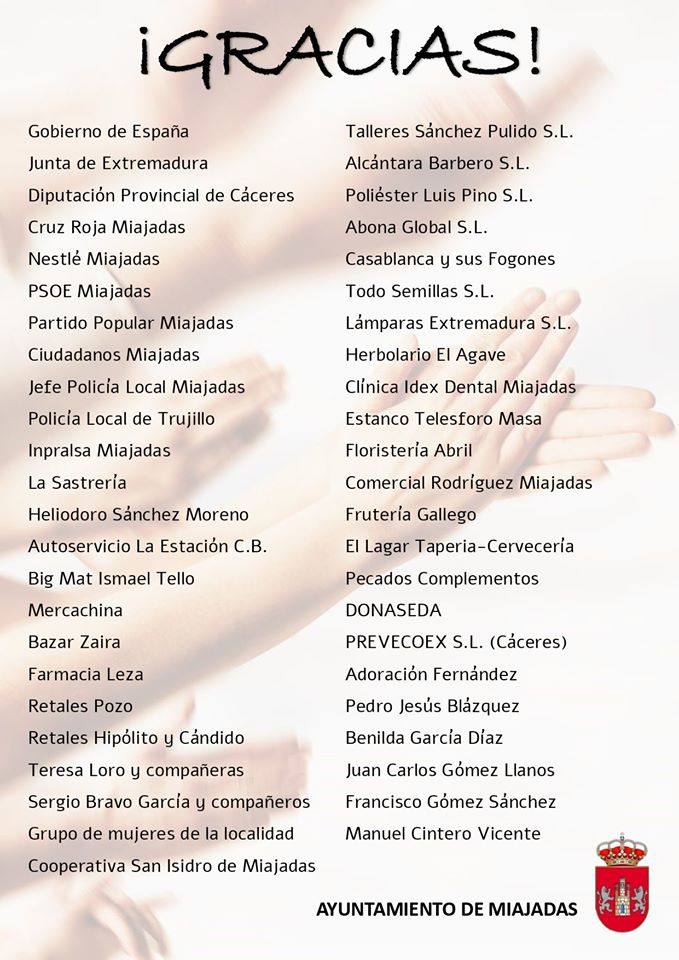 Empresas, instituciones, asociaciones, colectivos y particulares que han donado mascarillas, geles hidroalcohólicos, guantes, batas de protección, tela para la elaboración de batas, Equipos de Protección Individual, pantallas de protección facial o alimentos y bebidasEl Ayuntamiento de Miajadas llevaba tiempo queriendo hacer pública una lista de agradecimientos para poner nombre a las empresas, instituciones, asociaciones, colectivos y particulares, tanto ... de la localidad como de fuera de ésta, que han aportado su granito de arena para ayudar desde que comenzase la crisis sanitaria originada por el coronavirus.