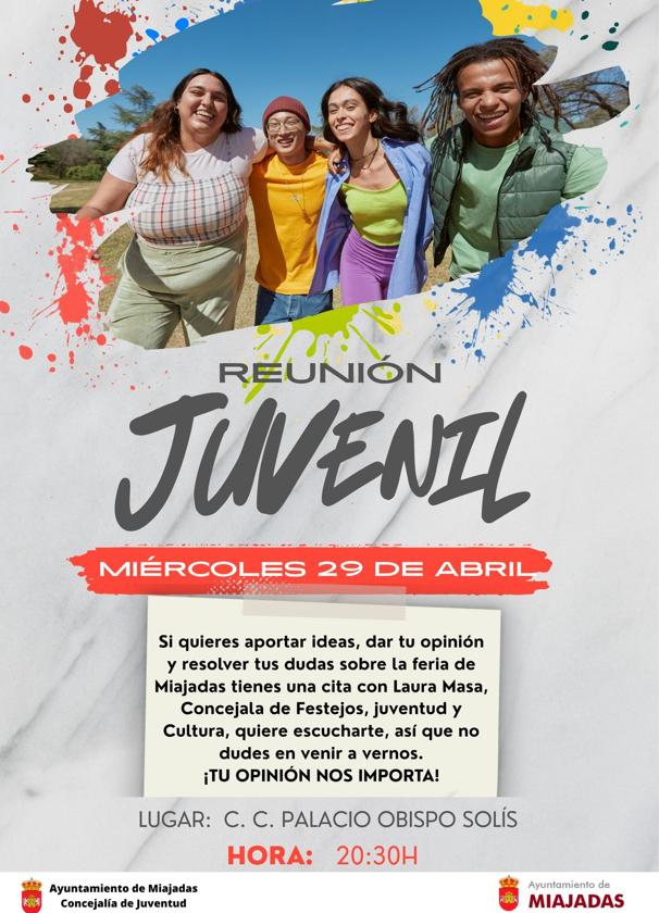 El encuentro, que será como se ha mencionado el miércoles 29 de abril, tendrá lugar en el Complejo Cultural Palacio Obispo Solís a partir de las 20.309 horas. Desde el Ayuntamiento miajadeños se anima a todos los jóvenes a «participar activamente».