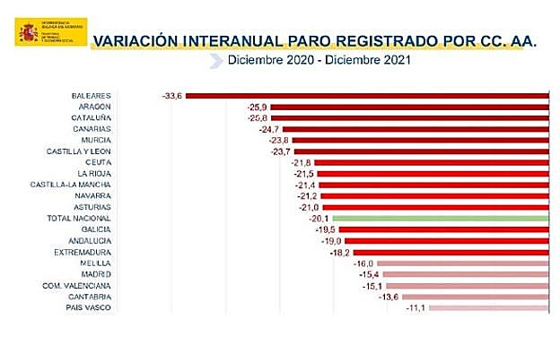 El secretario general de Empleo, Javier Luna, explicó que el descenso anual se ha producido sobre todo gracias al sector servicios (12.320 parados menos). Dos de sus principales actividades han vuelto a niveles de paro de 2019, la hostelería (-3.231), y el comercio (-1.915). Luna añadió que el descenso del desempleo ha impactado más entre las mujeres, gracias a los sectores públicos, la hostelería e incluso la agricultura.