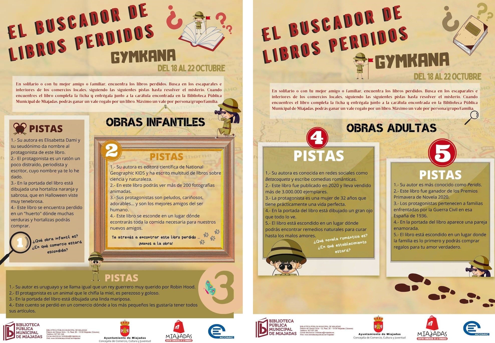 A lo largo de los días, hasta el próximo 22 de octubre, irán dando una serie de pistas para encontrar cinco de las nuevas obras literarias que se ofrecerán en préstamo con motivo del «Día de la Biblioteca», «como si de un verdadero tesoro se tratara». Las pistas se publican vía Facebook, Twitter e Instagram del Ayuntamiento de Miajadas.