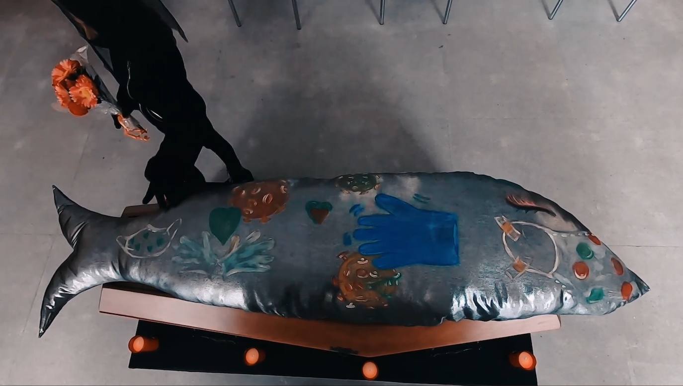 Los alumnos de los cursos de Corte y Confección y de Dibujo y Pintura 2020-21 de la Universidad Popular han colaborado diseñando y componiendo la sardina, mientras que RTV Miajadas ha cedido el audio del entierro del pasado año.