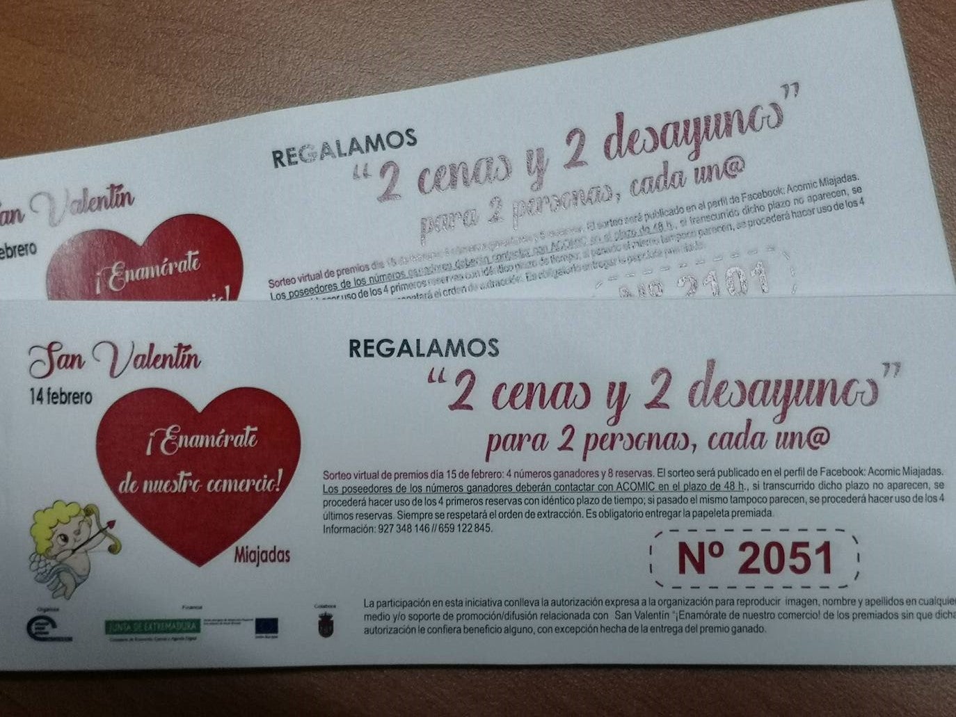 Por las compras realizadas hasta el día 14 de febrero, o bien hasta agotar talonarios, los establecimientos participantes regalan a sus clientes papeletas para el sorteo de dos cenas románticas y dos desayunos especiales, a disfrutar en el sector hostelero asociado una vez tengan autorizada su apertura. Cada papeleta es para dos personas.