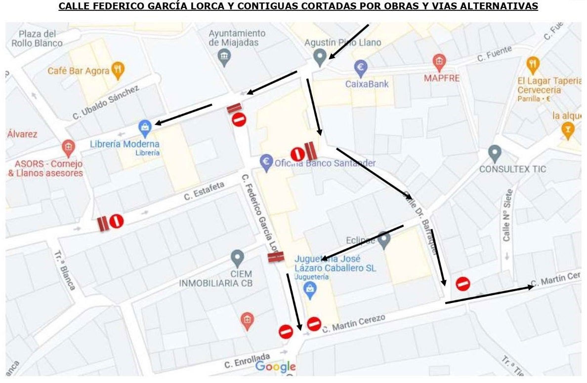 Debido a las obras la calle ha tenido que ser cortada al tráfico, por lo que el Ayuntamiento ha publicado un plano con las vías alternativasHOY MIAJADAS