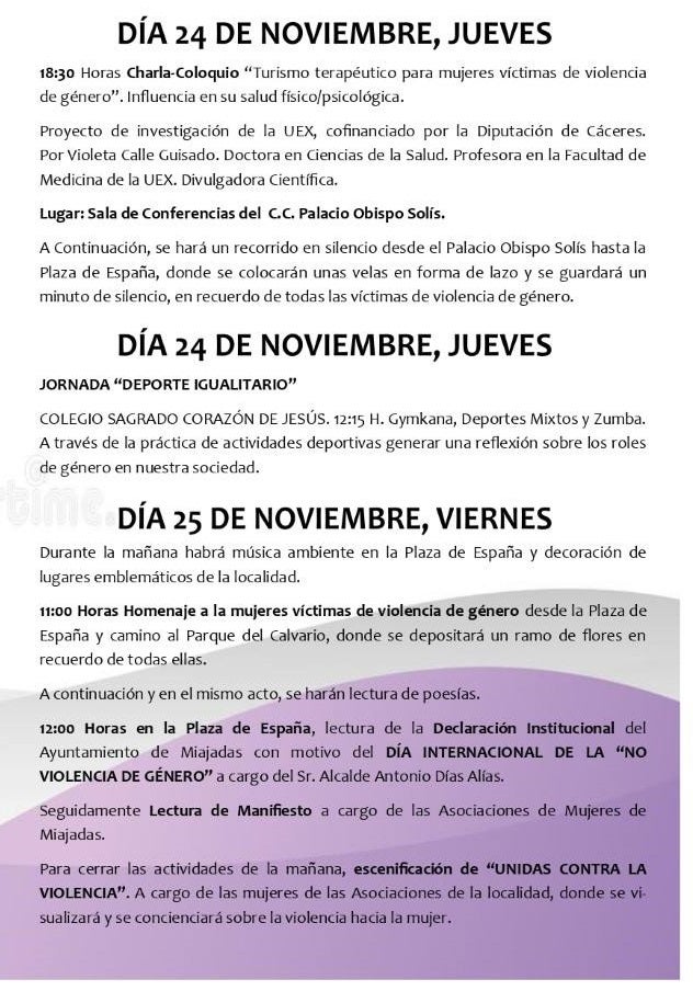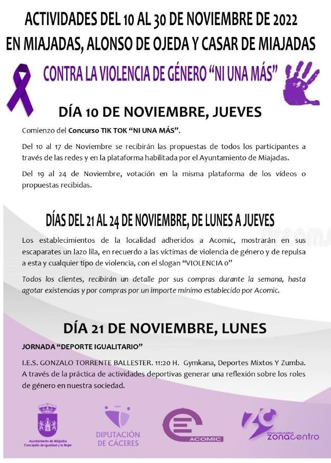 Con motivo del Día Internacional de la eliminación de la Violencia contra la Mujer, que tendrá lugar el próximo 25 de noviembre, Miajadas desarrolla su ... propia Semana contra la Violencia hacia la Mujer.