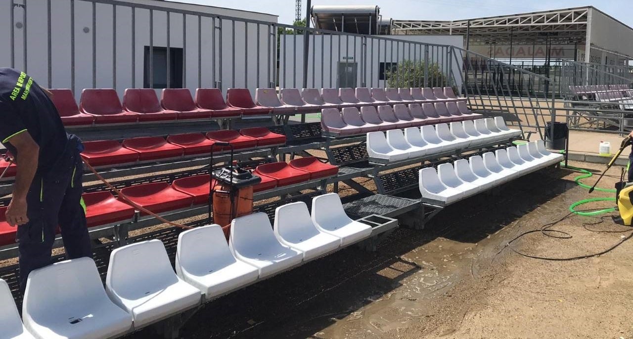 Tras haber concluido con las gradas techadas ... y sin techar del estadio municipal, han continuado con las del campo de fútbol de césped artificial, para devolverles el brillo original a los colores blanco y rojo.