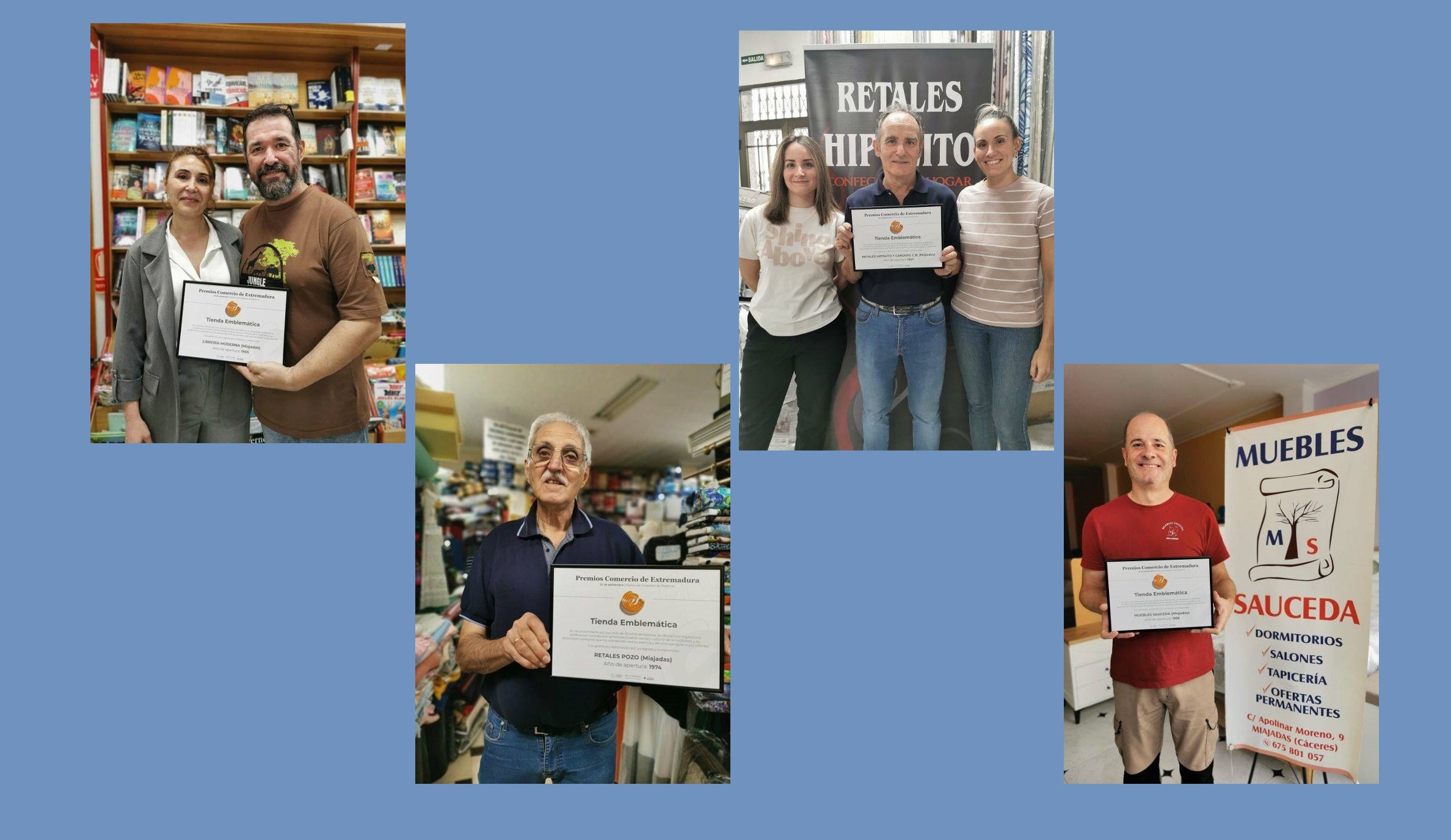 'Librería Moderna', 'Retales Hipólito', 'Muebles Sauceda' y 'Retales Pozo', con más de 50 años de trayectoria, fueron reconocidas en el II Foro de Comercio de ExtremaduraCuatro empresas miajadeñas han resultado premiadas en el II Foro de Comercio de Extremadura, celebrado el miércoles 25 de septiembre en Plasencia.