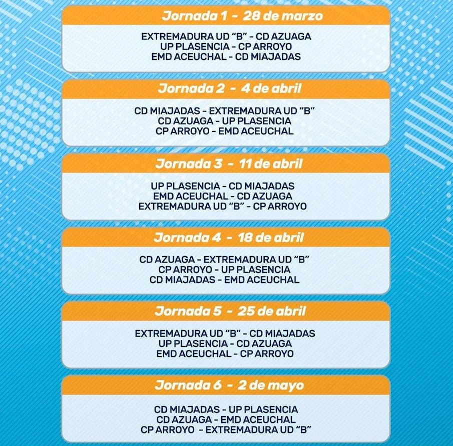El equipo ya conoce el calendario mediante el que se enfrentarán al Extreamadura B, Plasencia y AceuchalEl C.D. Miajadas ya conoce el calendario de la Fase 2 de temporada, mediante el que se enfrentarán a partidos de ida y vuelta al Extremadura B, Plasencia y Aceuchal, comenzando en casa de este último el próximo domingo a las 18:00.