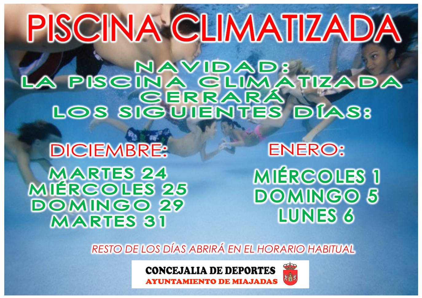Las instalaciones cerrarán un total de siete días, el resto de jornadas abrirá en horario habitualDurante estas navidades, la piscina climatizada de Miajadas cerrará los días festivos y prefestivos martes 24 Nochebuena, miércoles 25 Navidad, domingo 29 y martes 31 de diciembre, Nochevieja, así como el miércoles 1 de enero Año Nuevo, domingo 5 día de la cabalgata de reyes, y lunes 6 de enero, día de los Reyes Magos.
