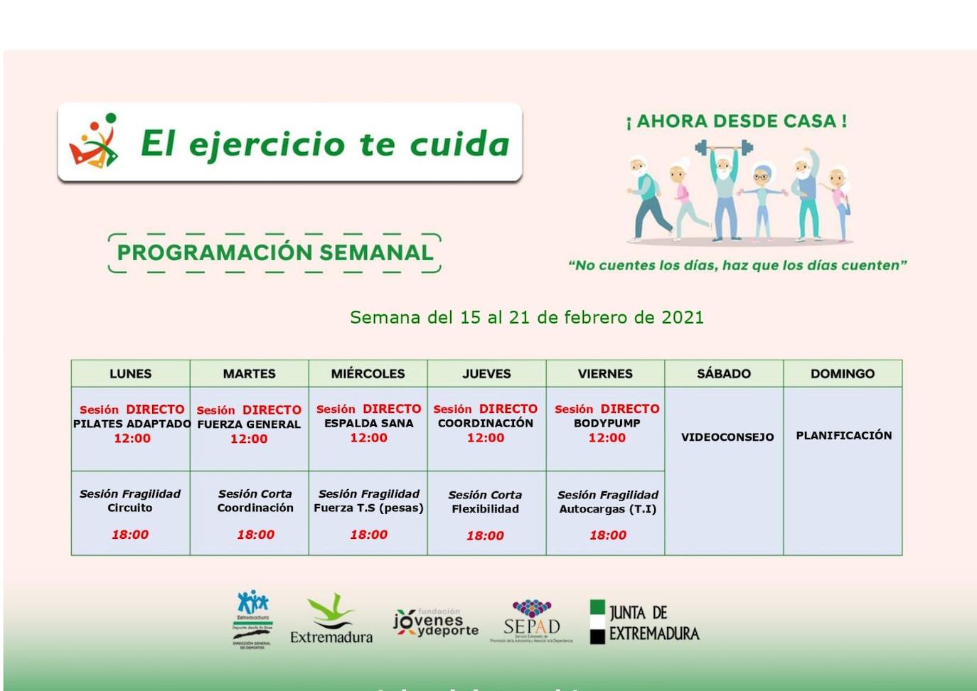 Esta semana las videosesiones y directos, además de las actividades ya familiares destinadas a fuerza, coordinación, flexibilidad y ejercicios para el tren superior e inferior o mantener una espalda sana, también incorpora una sesión de pilates adaptado y otra de bodyjump. La semana concluirá con el videoconsejo del sábado.