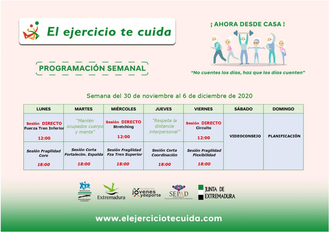 Mediante sesiones en directo por la mañana y video sesiones por la tarde, de una hora y media hora respectivamente, los Técnicos salud-deportivos ayudan a los deportistas más caseros a reforzar el tren inferior, fortalecer la espalda, trabajar la coordinación y realizar ejercicios de 'Stretching', conocido como 'el nuevo Pilates'. Sin olvidar el tradicional videoconsejo del sábado, que cada semana es una sorpresa para mantenerse activos.