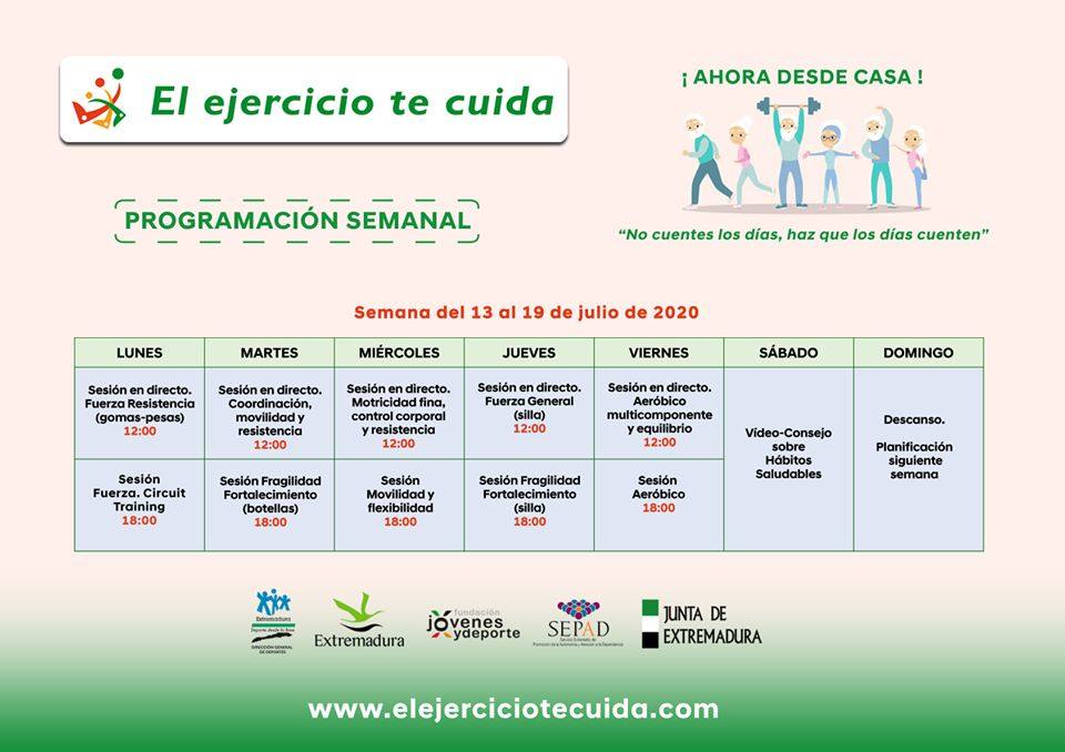 La programación de esta semana trabaja la fuerza y resistencia con gomas y pesas, la motricidad fina y control corporal y mejorar la fragilidad mediante el fortalecimiento de distintas partes del cuerpo, así como ejercicios aeróbicos multicomponentes, sin olvidar el tradicional vídeo-consejo del sábado.