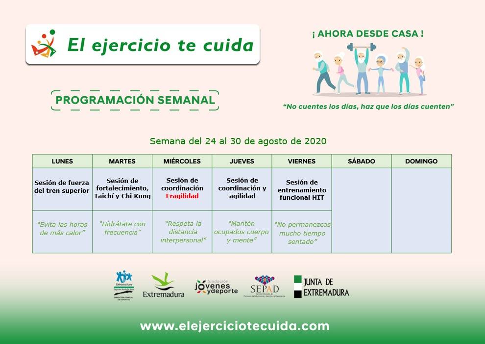 Sesiones de fuerza del tren superior; fortalecimiento, tai chí y chi kung; ejercicios de coordinación dirigidos a la fragilidad o a la agilidad; y sesiones de entrenamiento funcional HITEl programa 'El ejercicio te cuida en casa', impulsado por la Fundación Jóvenes y Deporte, despide el mes de agosto con sesiones recordatorias de los casi 200 ejercicios emitidos, mientras prepara nuevos contenidos para su particular 'vuelta al cole' en septiembre.
