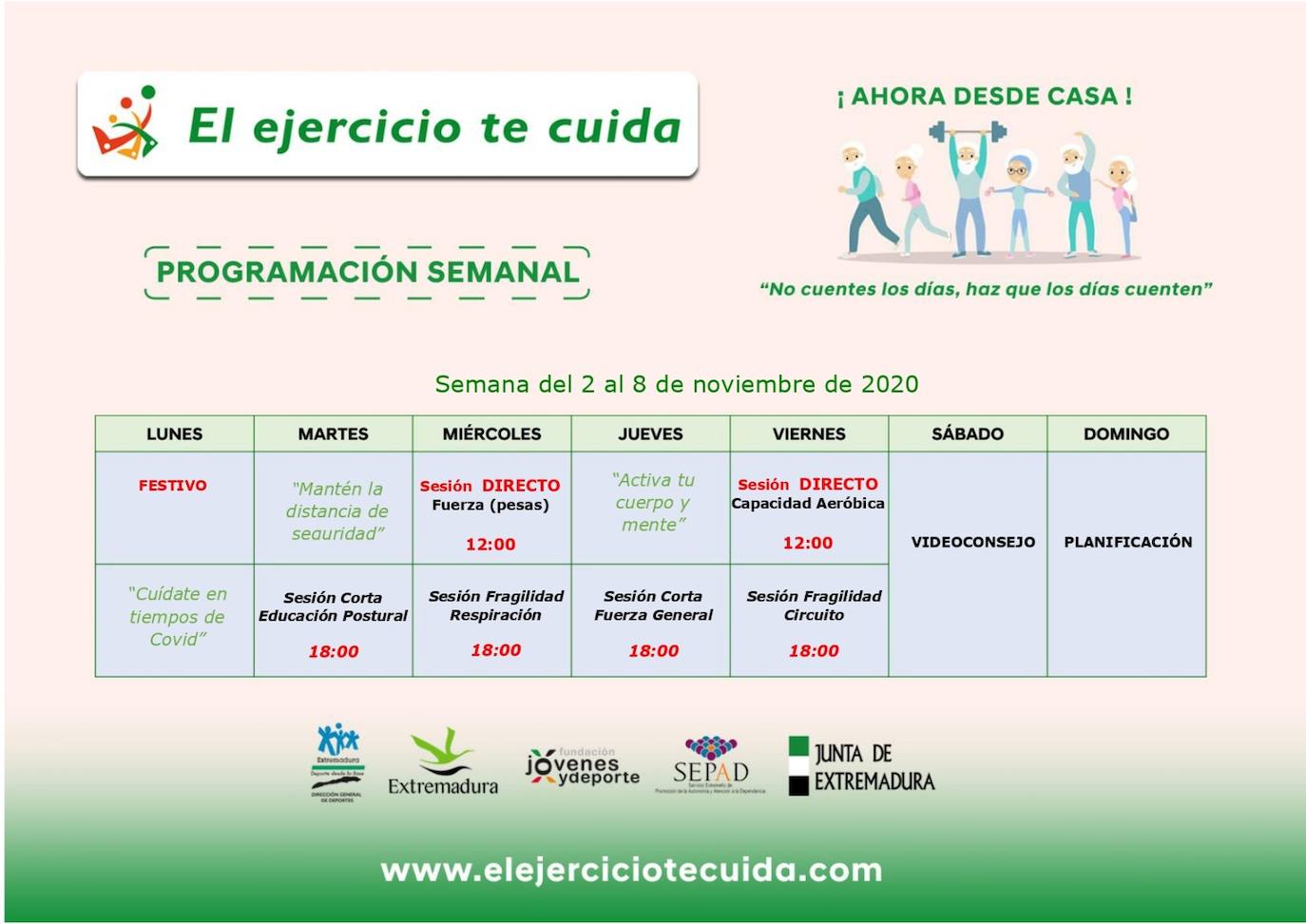 Esta semana, que ha empezado un poco más tarde con el puente, ofrecen sesiones para ir cogiendo fuerzas de cara a este otoño-invierno que se presenta largo, así como indicaciones de control de la respiración. Ya sea mediante sesiones en directo o video-sesiones, incluyendo el consejo semanal tradición de los sábados, que ya se echaba de menos. El ejercicio te cuida en casa