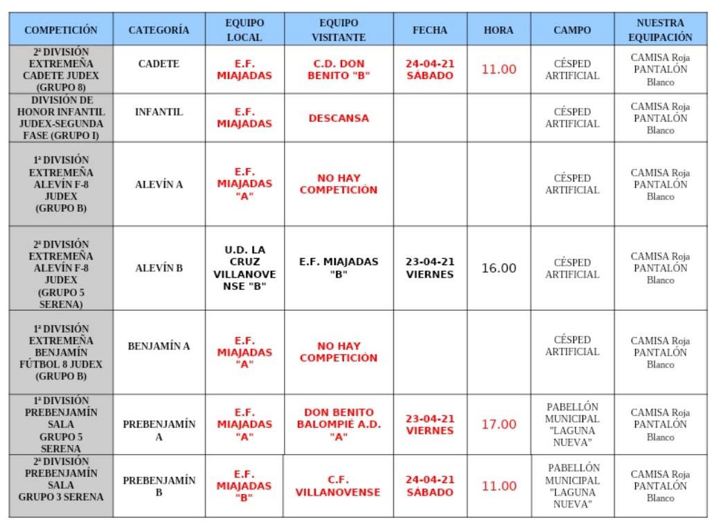 La Escuela de Fútbol de Miajadas será la anfitriona en todos los partidos de este fin de semana, 23 y 24 de abril, en las categorías de cadetes y prebenjamines.