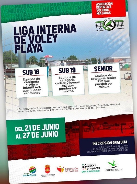 Categorías Sub 16 alevín e infantil 4x4, Sub 19 cadete y juvenil 3x3, y Senior 2x2La liga interna de voley playa de Miajadas, que se celebrará del 21 al 27 de junio, será la encargada de inaugurar la temporada de verano 2021, finalizando así la de voley pista.