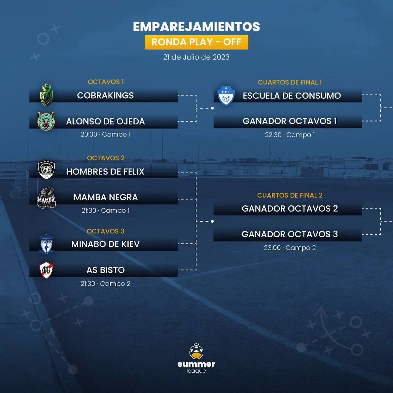 De esta forma, Alonso de Ojeda C.F., AS Bisto, Cobrakings, Los hombres de Félix, Mamba Negra, Escuela de Consumo y Minabo de Kiev se enfrentarán esta noche en varios partidos de octavos y cuartos de final, hasta que sólo queden dos, que se enfrentarán en semis a los otros dos equipos ya clasificados.