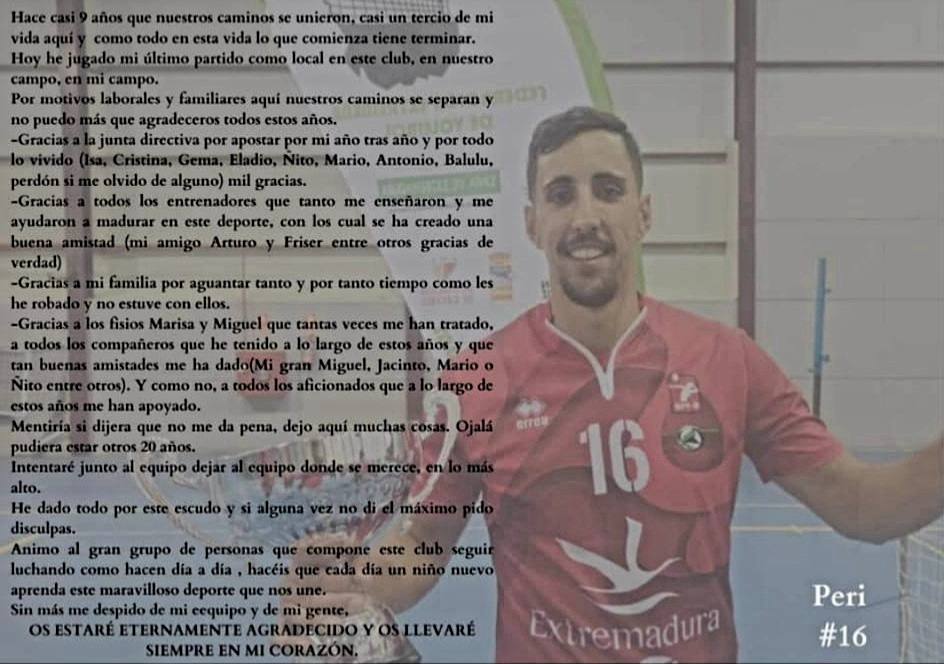 Por su parte, 'Peri' ha querido despedirse oficialmente de Miajadas: su club, su afición, sus compañeros y amigos. Una familia que encontró en esta etapa de su vida y que, por motivos personales, llega a su fin para dar inicio a otra nueva.