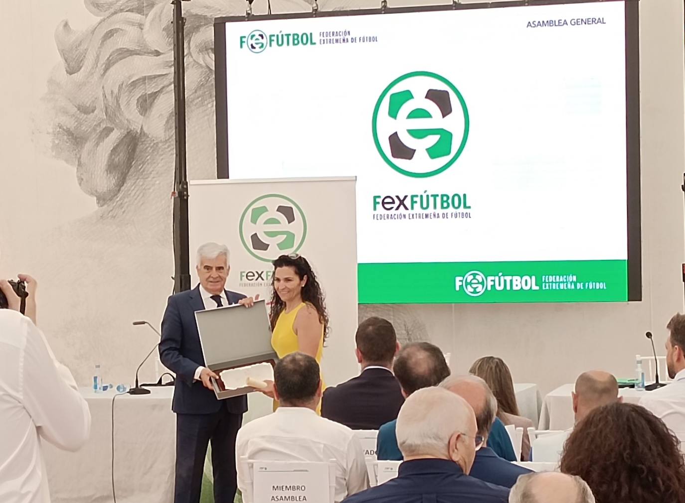 El alma de la Escuela de Fútbol de Miajadas recibió la placa de manos del presidente de la FEX Fútbol, Pedro Rocha, en un reconocimiento por su labor en la escuela y a sus años dedicados al fútbol.
