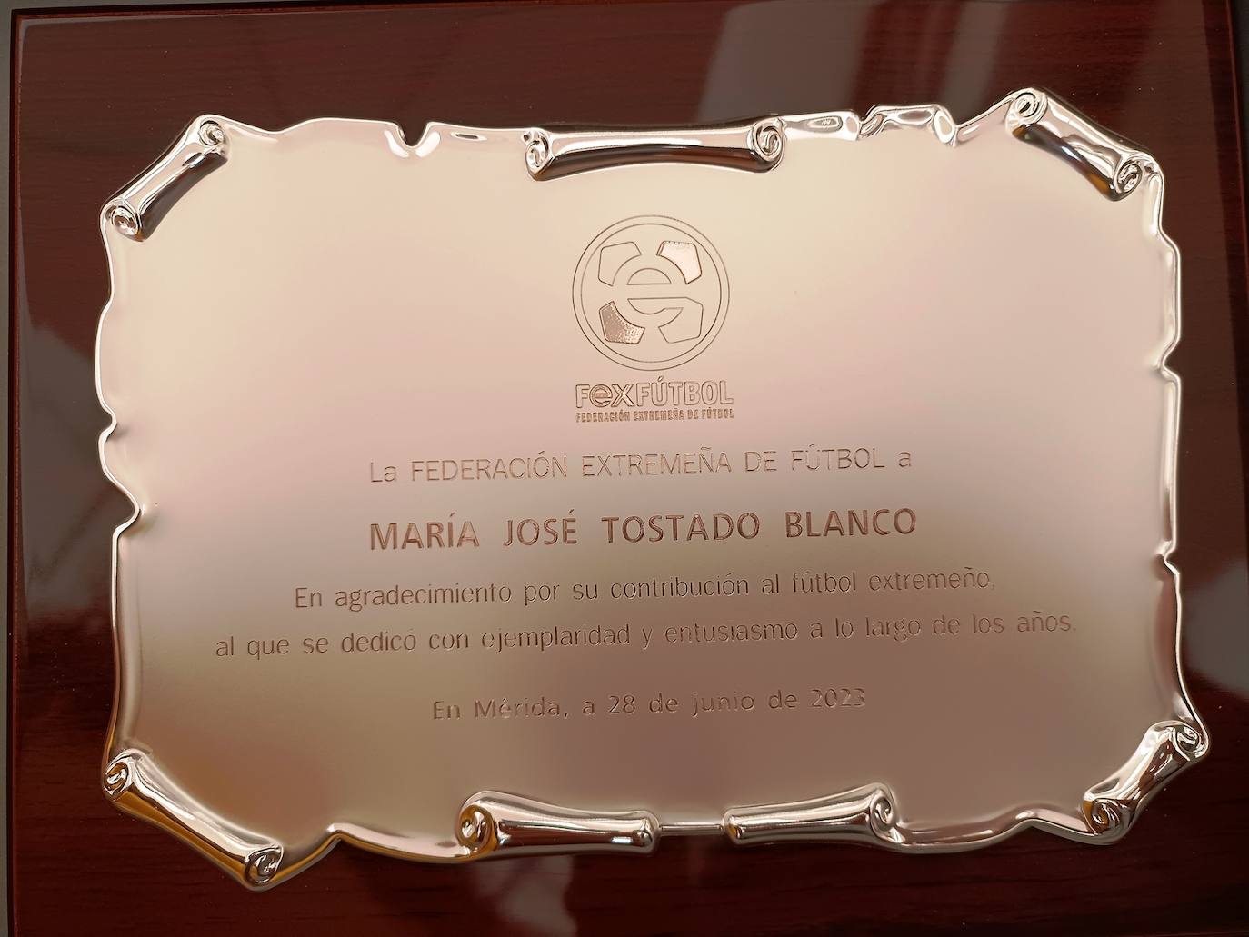 El alma de la Escuela de Fútbol de Miajadas recibió la placa de manos del presidente de la Federación Extremeña de Fútbol, Pedro RochaLa Federación Extremeña de Fútbol ha reconocido la labor y trayectoria de la miajadeña María José Tostado Blanco en este deporte.