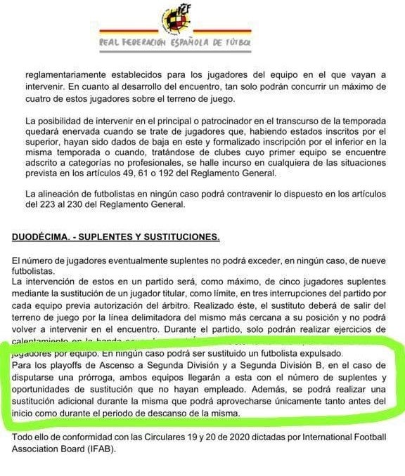 Según el reglamento, en los encuentros de ascenso a Segunda División y Segunda División B, en caso de llegar a prórroga, ambos equipos contarán con los cambios que aún no hubieran utilizado más un cambio adicional, debiendo éste último realizarse antes del comienzo de prórroga o en el descanso de ésta.