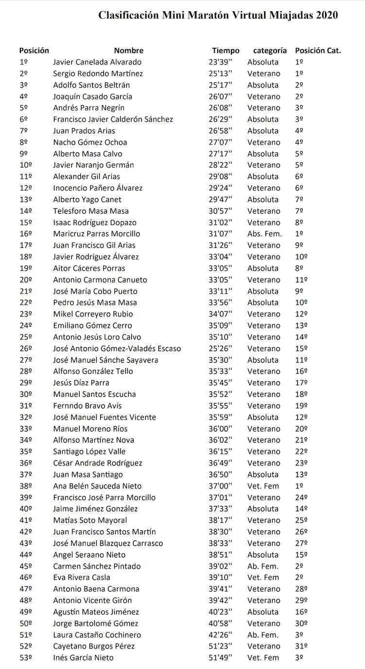 Han participado 53 corredores de Miajadas, Escurial, Almoharín, Trujillo, Don Benito, Badajoz, Almaraz, Navalmoral de la Mata, e incluso de Tudela, Madrid, Huelva y San SebastiánLa Minimaratón virtual organizada el pasado fin de semana por el Club de Atletismo y la Concejalía de Deportes de Miajadas ya tiene ganadores.
