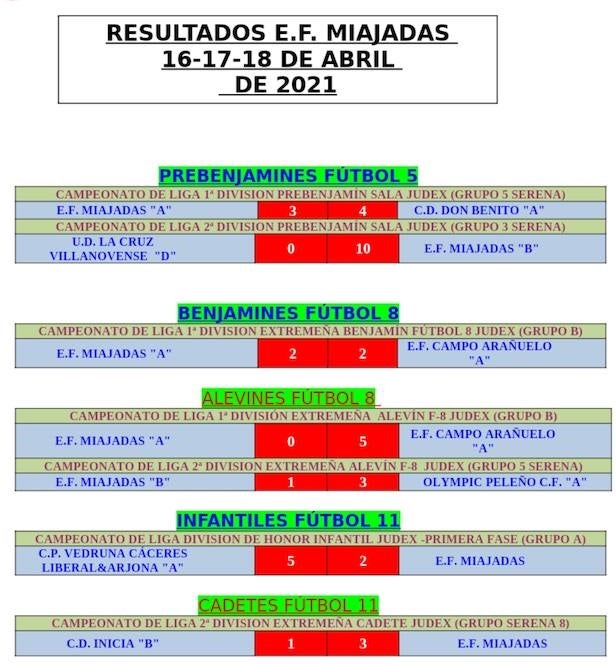En lo que respecta a la Escuela de Fútbol de Miajadas, los prebenjamines B y los cadetes ganaron, los benjamines empataron, y los prebenjamines A, alevines e infantiles perdieron.