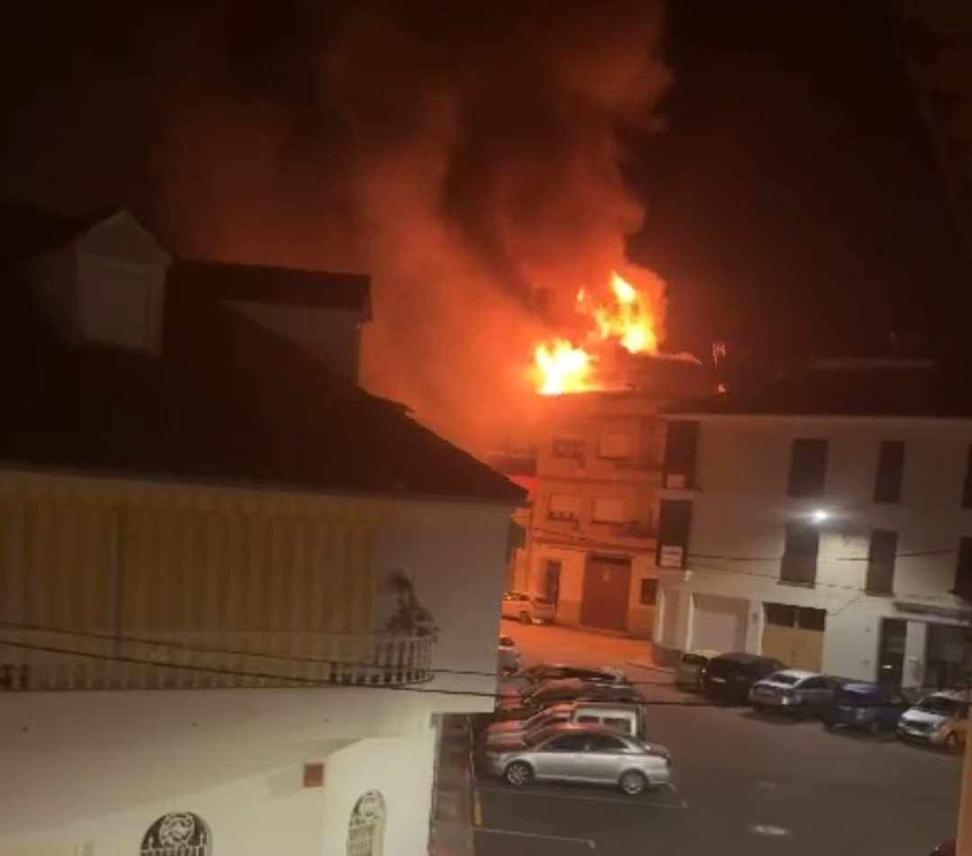 Los vehículos estacionados en la zona tuvieron que ser retirados, ya que caían restos del fuegoLos vecinos de un edificio de Miajadas tuvieron que ser desalojados tras un incendio en la terraza del ático.