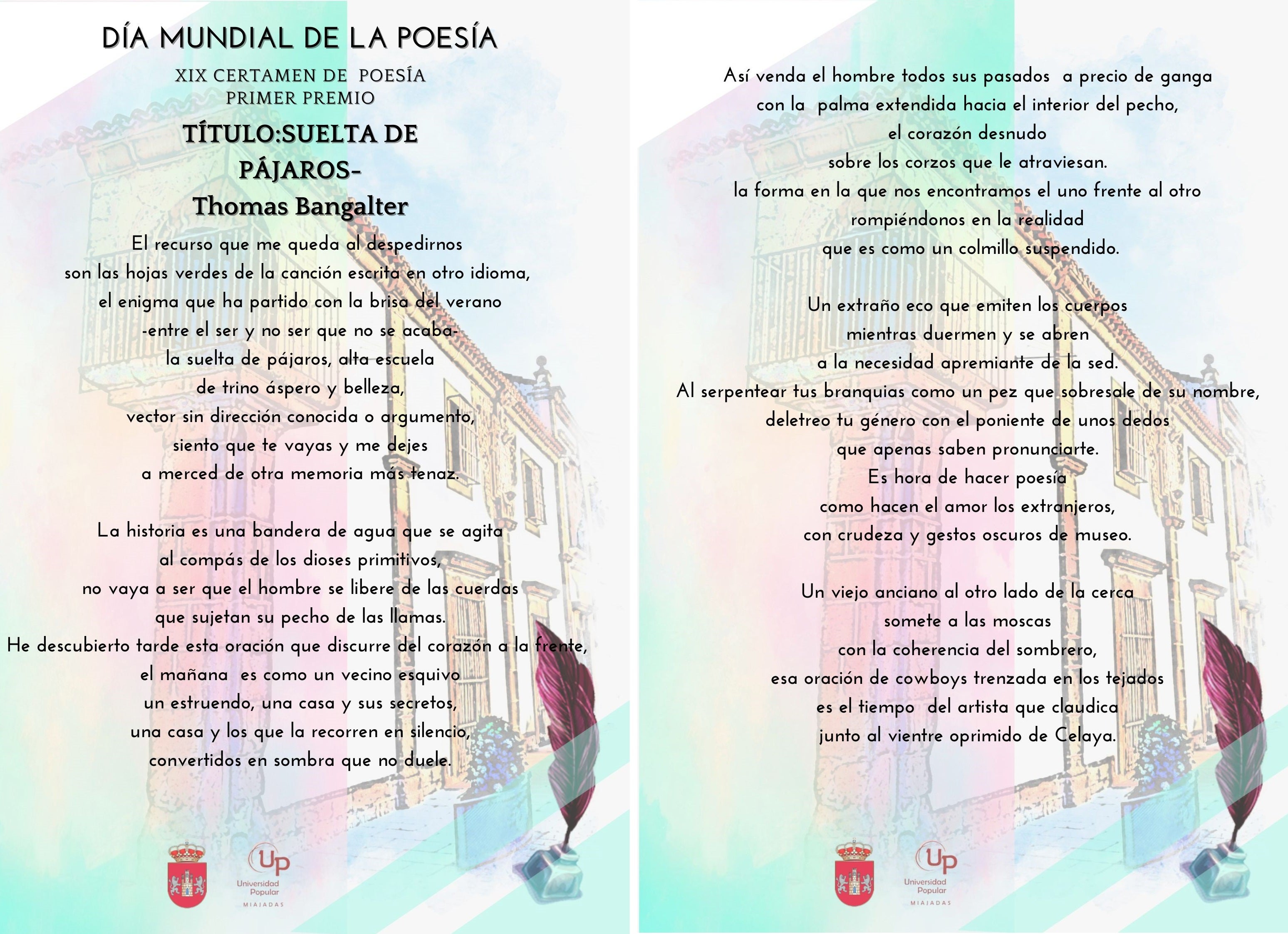 Día Mundial de la Poesía con 'Suelta de pájaros', ganadora del XIX Certamen de Poesía de Miajadas