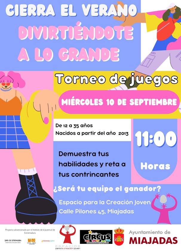 El próximo miércoles, día 10 de septiembre, el Espacio para la Creación Joven de Miajadas organizará un torneo de juegos dirigido a jóvenes de entre 12 y 35 años de edad.