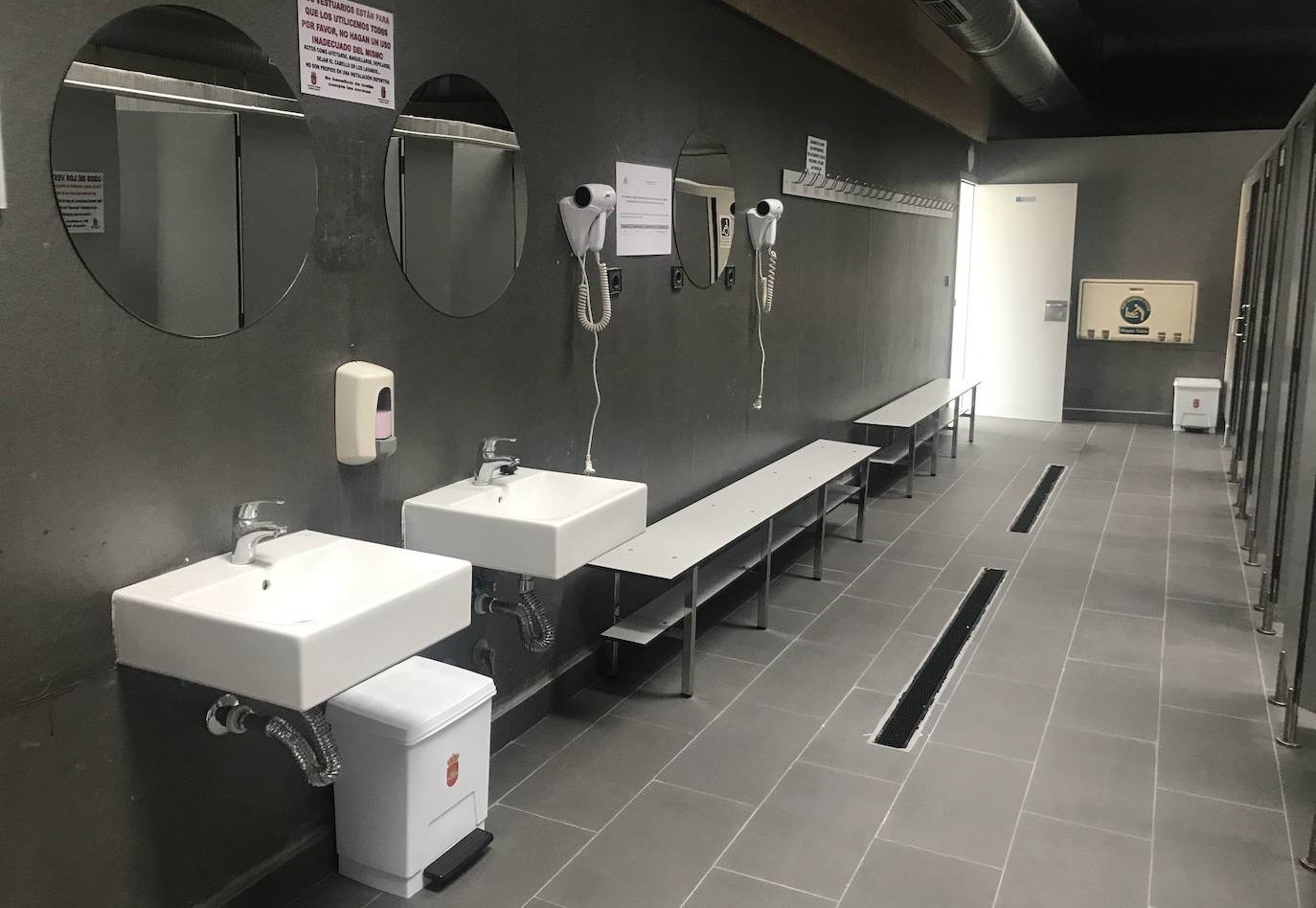 Debido al mal estado en que se encontraba el suelo de los vestuarios anteriores, con filtraciones de agua al almacén donde se encuentra el pele que alimenta las calderas de la piscina, los operarios han levantado todas las cabinas de duchas e inodoros con el fin de sustituir el suelo anterior y cambiar la lámina de caucho.