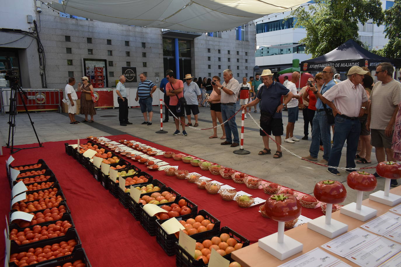 Un total de 73 ejemplares y cajas han participado este año en la actividad protagonizada por lo mejor de la huerta tomatera en Miajadas y alrededores, el XXIX Concurso del tomate, y que ha repartido un total de 2.500 euros en premios. En la categoría de mayor peso el ganador ha sido Julián Sánchez, con un tomate que ha pesado sobre la báscula 1,558 kilos, nada más y nada menos. En segunda posición ha quedado un ejemplar de 1,496 kilos, presentado por Juan Gabriel Loro, y en tercera posición ha quedado Antonio Jesús Cañamero con un tomate de 1,410 kilos. En la categoría de tomate más singular, el primer premio local ha sido para Juan Parejo, el tomate más estético ha sido el perteneciente a la huerta de Francisca Mayoral. Pasando a la mejor caja de fábrica local, la ganadora ha sido Flor Cintero, y en la caja de verdeo el trofeo ha sido para Raúl Redondo.