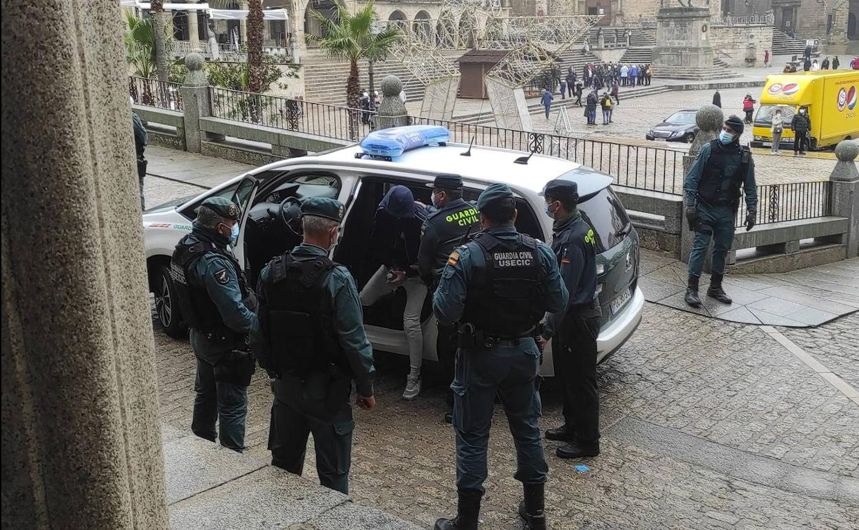 El detenido ha llegado en torno a las 10.50 horas a los juzgados de la localidad bajo un fuerte dispositivo de seguridad desplegado por la Guardia Civil y en el que han participado diez agentes de la Unidad de Seguridad Ciudadana de la Comandancia. El hombre ha bajado encapuchado del vehículo en el que ha sido trasladado hasta los juzgados, ubicados en la Plaza Mayor de Trujillo.