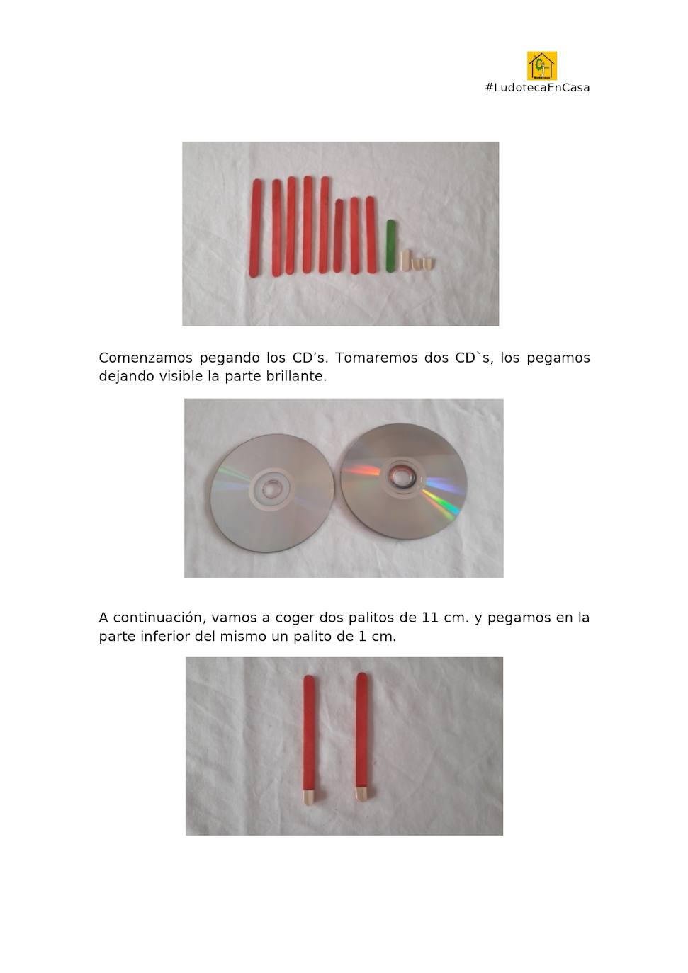 Para elaborar la manualidad tan sólo es necesario utilizar materiales reciclados: 4 cds, 10 palitos de madera de colores, goma eva gris, dos palillos, pistola de silicona, regla, lápiz, y tijeras.
