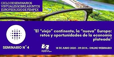 Mañana jueves 18 de junio, a las 09:30 horas, el ciclo de seminarios virtuales sobre asuntos europeos 2020 de FEMPEX 'Construyendo la nueva Europa desde lo local: un espacio para encontrar caminos diferentes ante una situación excepcional', presentará en su formato webinario su tema nº 4, titulado: 'El «viejo» continente, la «nueva» Europa: retos y oportunidades de la economía plateada'. Para participar deben inscribirse a través del enlace Inscripción seminario virtual Crecimiento demográfico en Europa