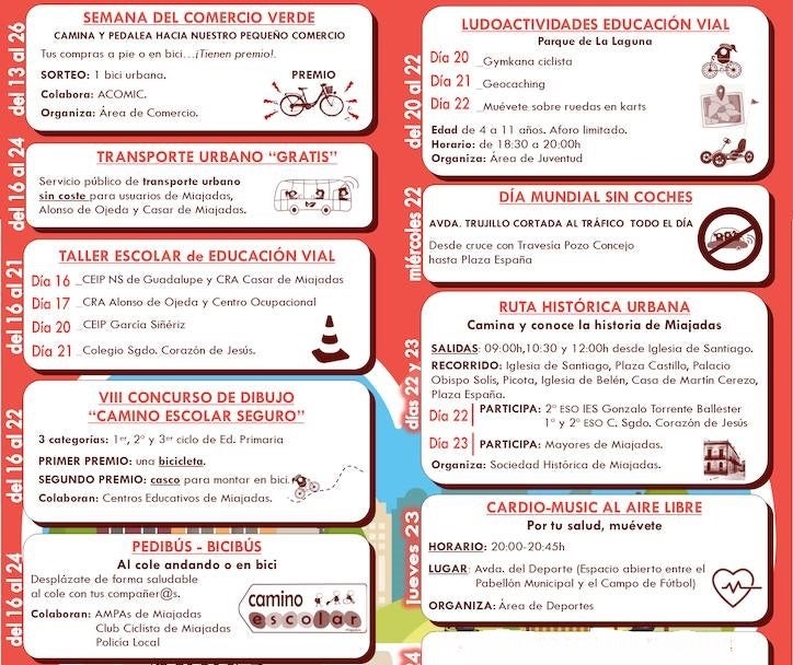 También se llevarán a cabo iniciativas y actividades sobre movilidad sostenible, sobre todo las relacionadas con los medios de transporte: transporte urbano gratis, así como el interurbano con Alonso de Ojeda y Casar de Miajadas; corte al tráfico de la avenida Trujillo el 'Día Mundial sin coches' 22 de septiembre; talleres sobre Educación vial; VIII Concurso de dibujo 'Camino escolar seguro', con una bicicleta como primer premio y un casco de bici como segundo; programa 'Al cole andando o en bici-pedibús-bicibús', con ocho rutas a pie y tres en bici; IV Concurso de Fotografía sobre Movilidad sostenible, con el sorteo de tres casos de bicicleta; la actividad 'Practica y pedalea en bici'; ludoactividades de educación vial 'Gymkana ciclista', 'Geocaching' y 'Muévete sobre ruedas en karts'; y ruta de senderismo al Pantano del Búrdalo. Todas ellas detalladas por María Isabel Cañamero, responsable de Educación Ambiental del Área de Medio Ambiente.