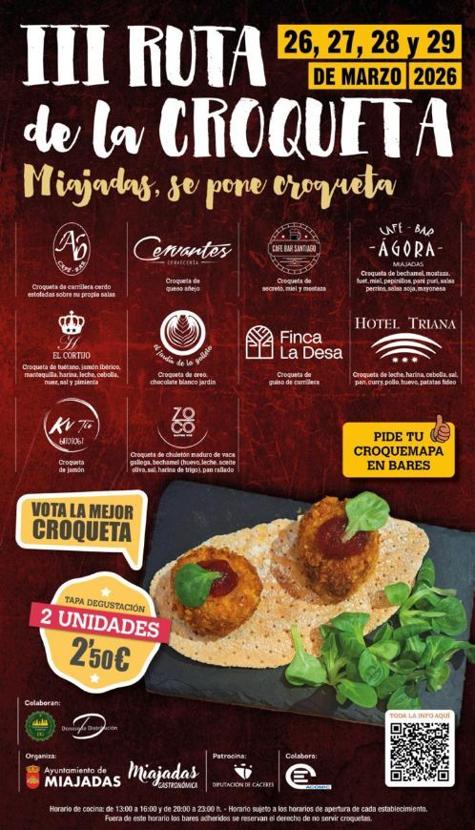 'Miajadas se pone croqueta' es el lema de la localidad para celebrar su ruta en honor a este alimento y que esta tercera edición se celebra entre el 26 y el 29 del presente mes de marzo.