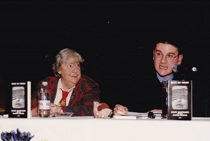 La relación entre ambos escritores comenzó a principios de los 90 por correspondencia postal semanal durante la Carrera Universitaria de Enfermería del miajadeño, afincado en Plasencia por aquel entonces. Poco después Julio fue invitado por Gloria a conocer su casa de Madrid y terminó instalándose en la capital para volcarse de lleno en la vida social y artística que le brindó su amiga y madrina.