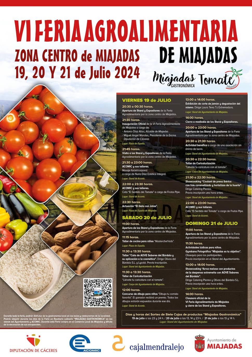Entre algunas de sus sugerentes propuestas se puede participar en talleres de cocina en directo, disfrutar de corte de jamón, degustaciones dónde los productos estrellas son el arroz, tomate, aceite, almendras… los productos que abren la puerta al turismo a Miajadas, la despensa de la Comarca.
