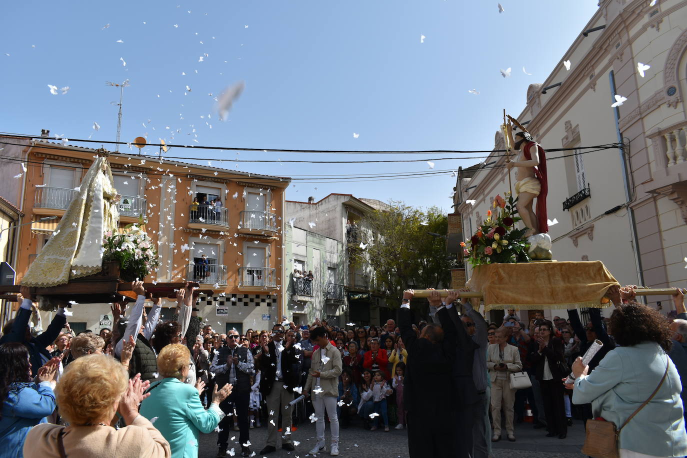 Un año más los miajadeños volvieron a celebrar el reencuentro entre Jesús Resucitado y la Santa Madre, alzando las Imágenes representativas con alegría. Tras ello, ambos cortejos se dirigieron hacia la Iglesia de Santiago para celebrar la tradicional misa del Domingo de Resurrección.