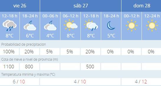 El domingo, día que se celebra la ruta ciclista Titán de los Ríos, el pronóstico de la agencia es de cielos despejados y nada de lluvia. La jornada del domingo será un poquito más calurosa que la del sábado. La mínima se mantendrá igual, en cuatro grados, y las máximas suben hasta los doce grados. Ingredientes perfectos hacer las delicias de todos los deportistas y espectadores.