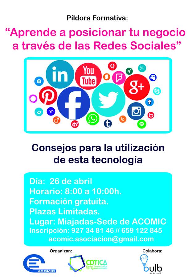 Acomic (Asociación de Comerciantes de Miajadas y Comarca) y Cdtica (Centro Demostrador TIC Agroalimentario) organizarán la píldora formativa denominada Redes Sociales con el objeto de que los comerciantes y empresarios aprendan a posicionar sus negocios a través de la redes sociales. La sesión formativa será impartida por NetBulb Social Media, empresa especializada en posicionamiento web.