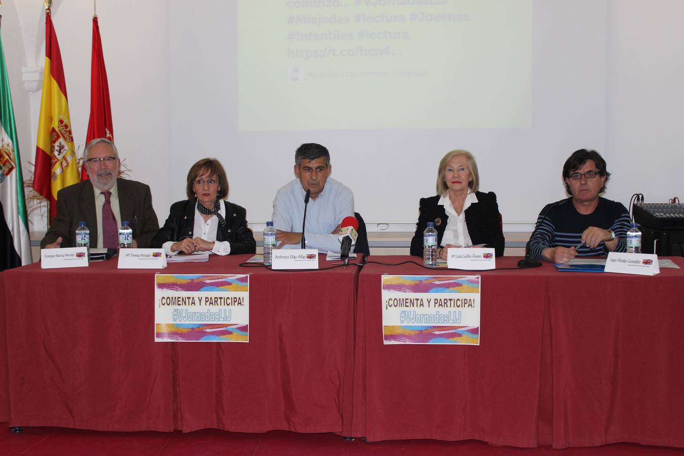 Por la tarde se inauguraron de manera oficial las jornadas con la presencia de Antonio Díaz, alcalde de Miajadas; Juan Florián, director del Centro de Profesores y Recursos de Trujillo; María Luisa Pintado, en representación del colegio García Siñeriz; María Luis Guillén, delegada provincial de la Consejería de Educación y Empleo; y Enrique Barcia, en representación de la Universidad de Extremadura. Este último expresó que «gracias al esfuerzo coordinado de especialistas y profesores hoy tenemos un gran plantel de que gente que ha ido perfilando la literatura infantil y juvenil». Por su parte, la delegada provincial opino que «las palabras impresas deben ser el enganche para el desarrollo de nuestra persona».