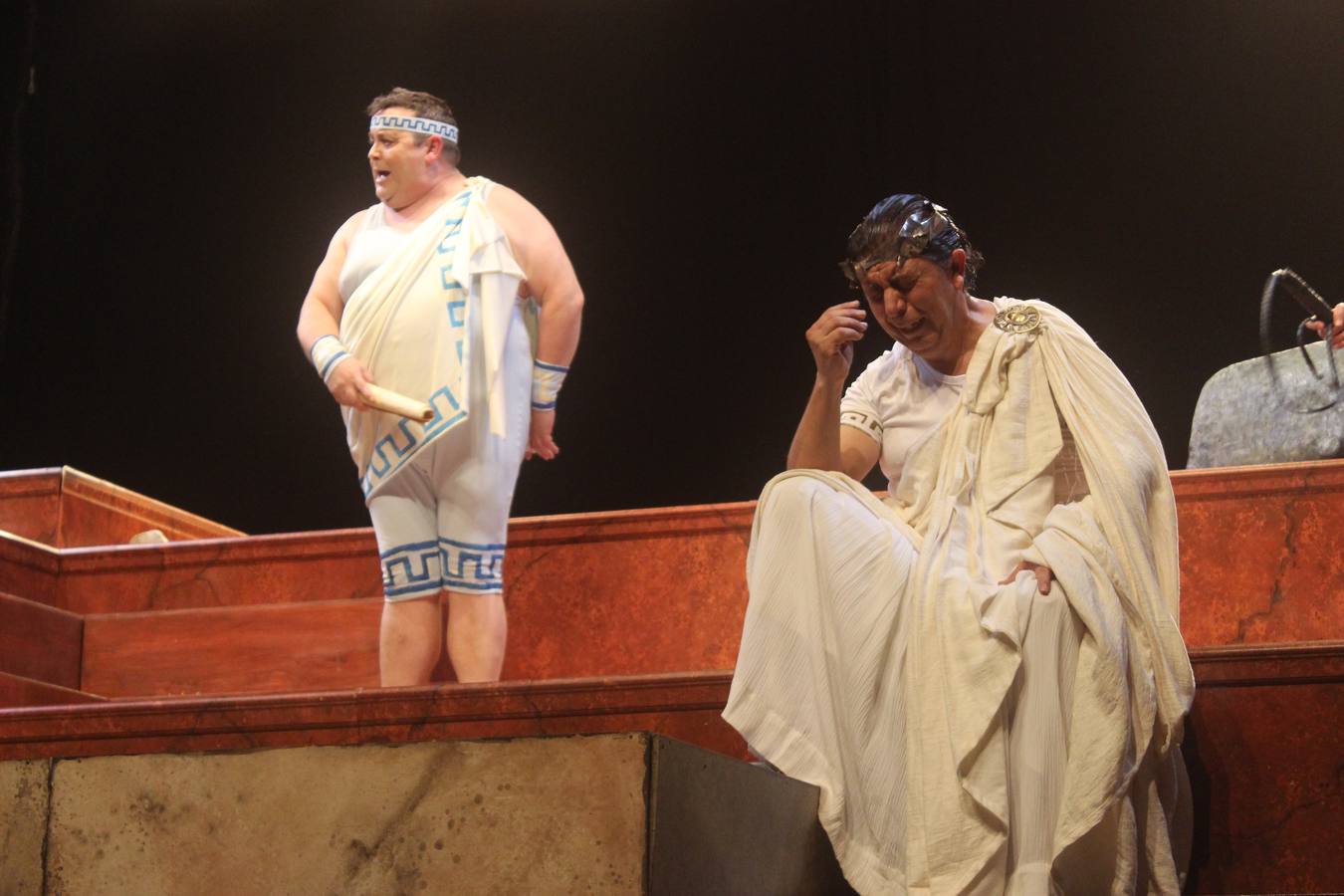 Ocho son los intérpretes extremeños que dan vida a los diez personajes de la obra. Estuvieron majestuosos Pedro Rodríguez (interpretando al rey Ántrax), Paca Velardiez (Elektra), Ana García (Menestra) y Jesús Martín Rafael (mensajero y Zeus). Al finalizar, el público se levantó de sus asientos y estalló un estruendo en forma de aplausos durante varios minutos. Es una forma de mianifestar que siempre es un placer acoger en el municipio obras de la talla de Los Pelópidas.