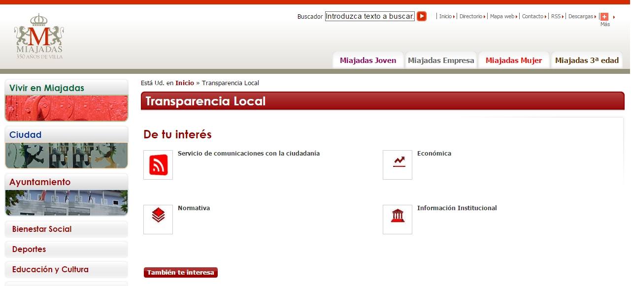 Desde diciembre del año 2015, todos los municipios del país están obligados a publicar en su web una serie de datos, que principalmente tienen que ver con el patrimonio del alcalde y los concejales y con la actividad diaria del Ayuntamiento. Las únicas informaciones que publica el Ayuntamiento de Miajadas son el desarrollo de las sesiones plenarias y datos de contratos adjudicados.